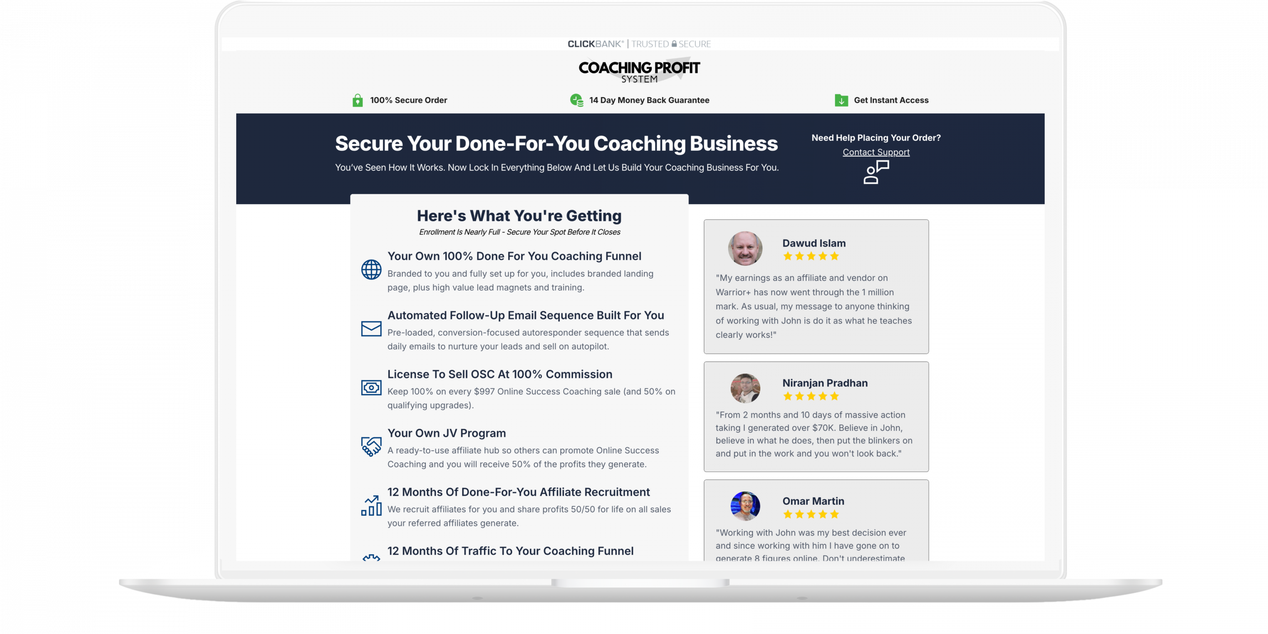 John even drives traffic and recruits affiliates, making this a true no brainer offer as this effectively gives them their own Coaching Business without creating products, running webinars, or coaching anyone