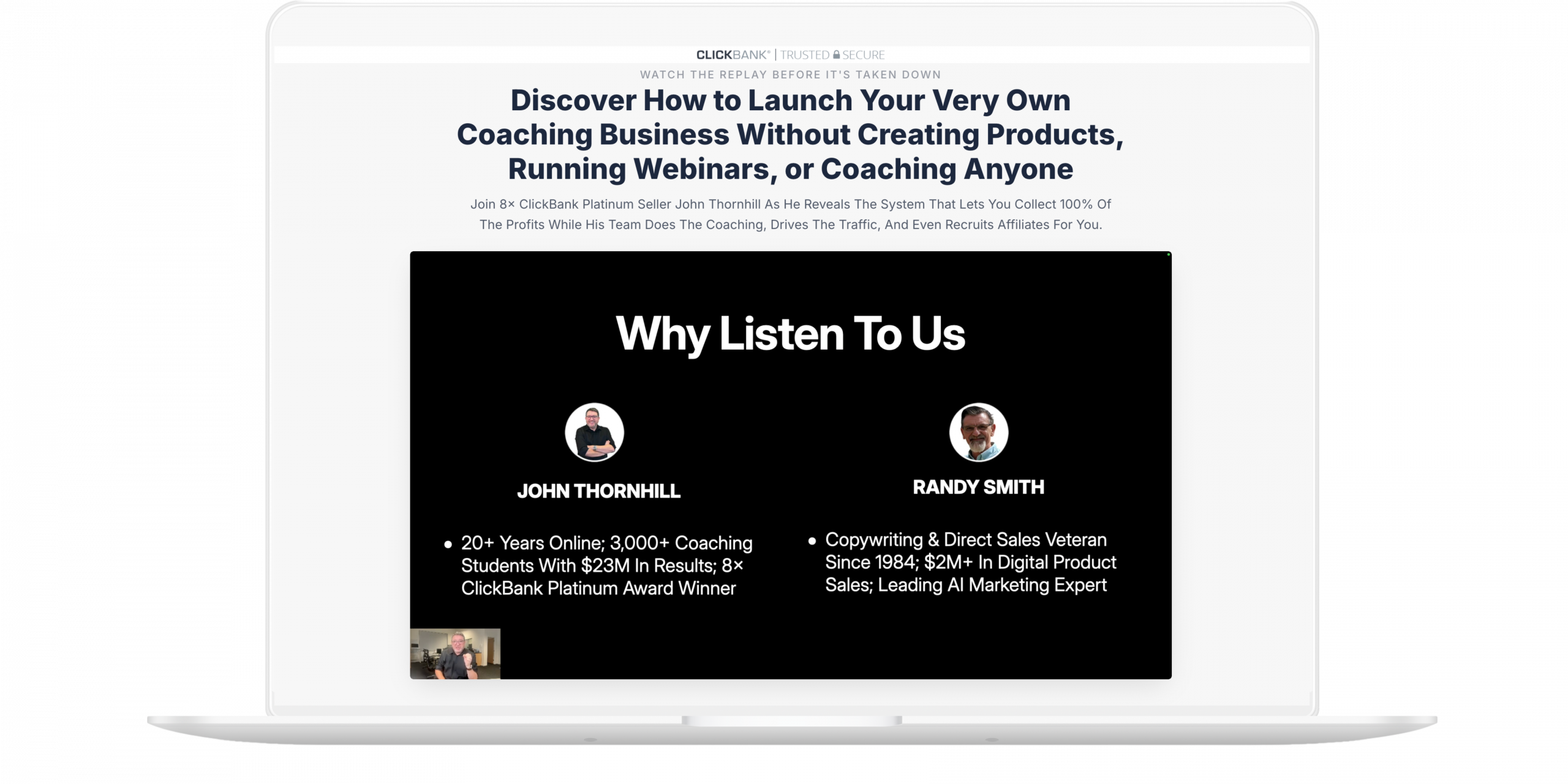 The Coaching Profit System is John Thornhill & Randy Smiths done-for-you business model that lets buyers own a coaching business without creating products, running webinars, or coaching anyone. John’s team handles setup, coaching, traffic, and affiliate recruitment, buyers keep 100% of the Online Success Coaching sales.